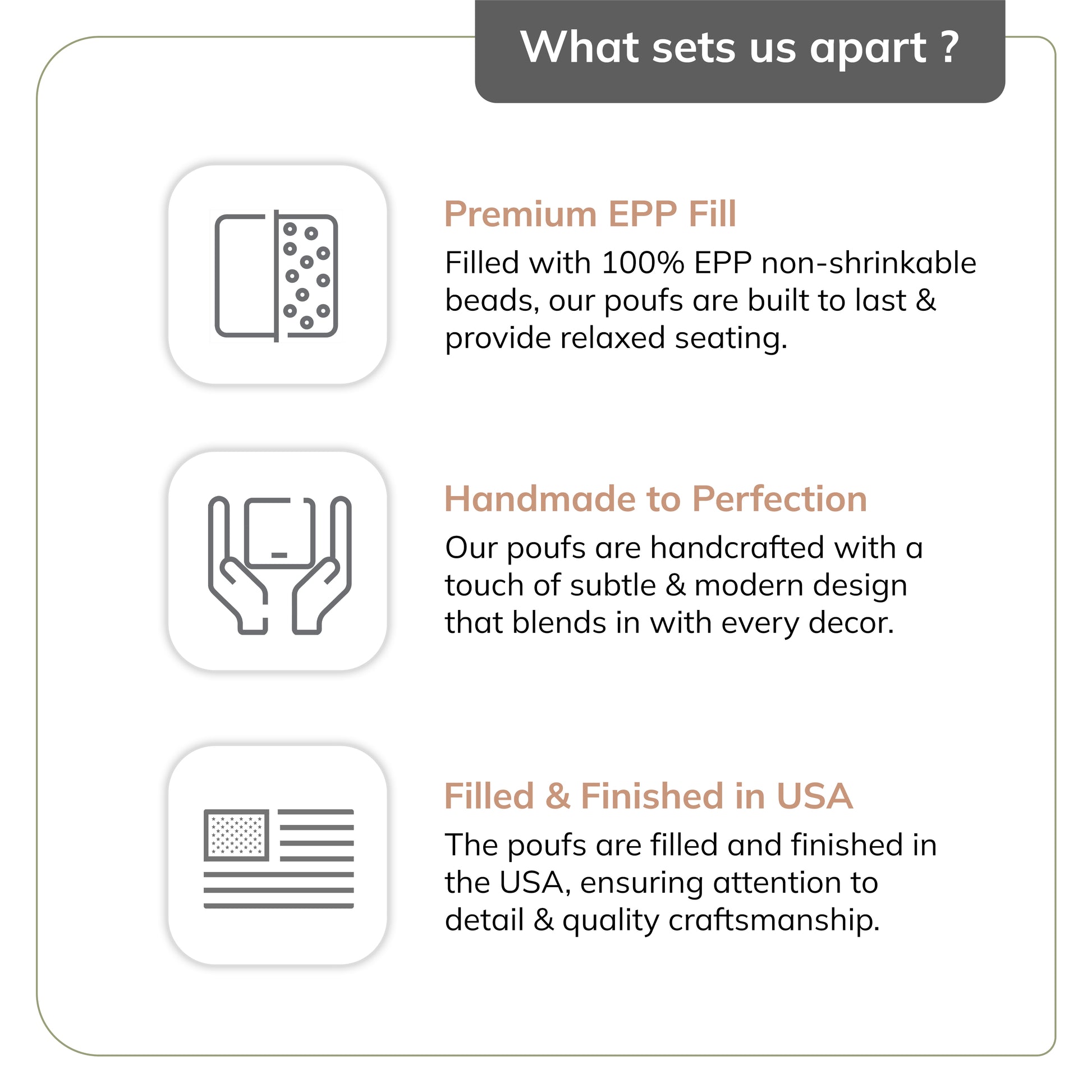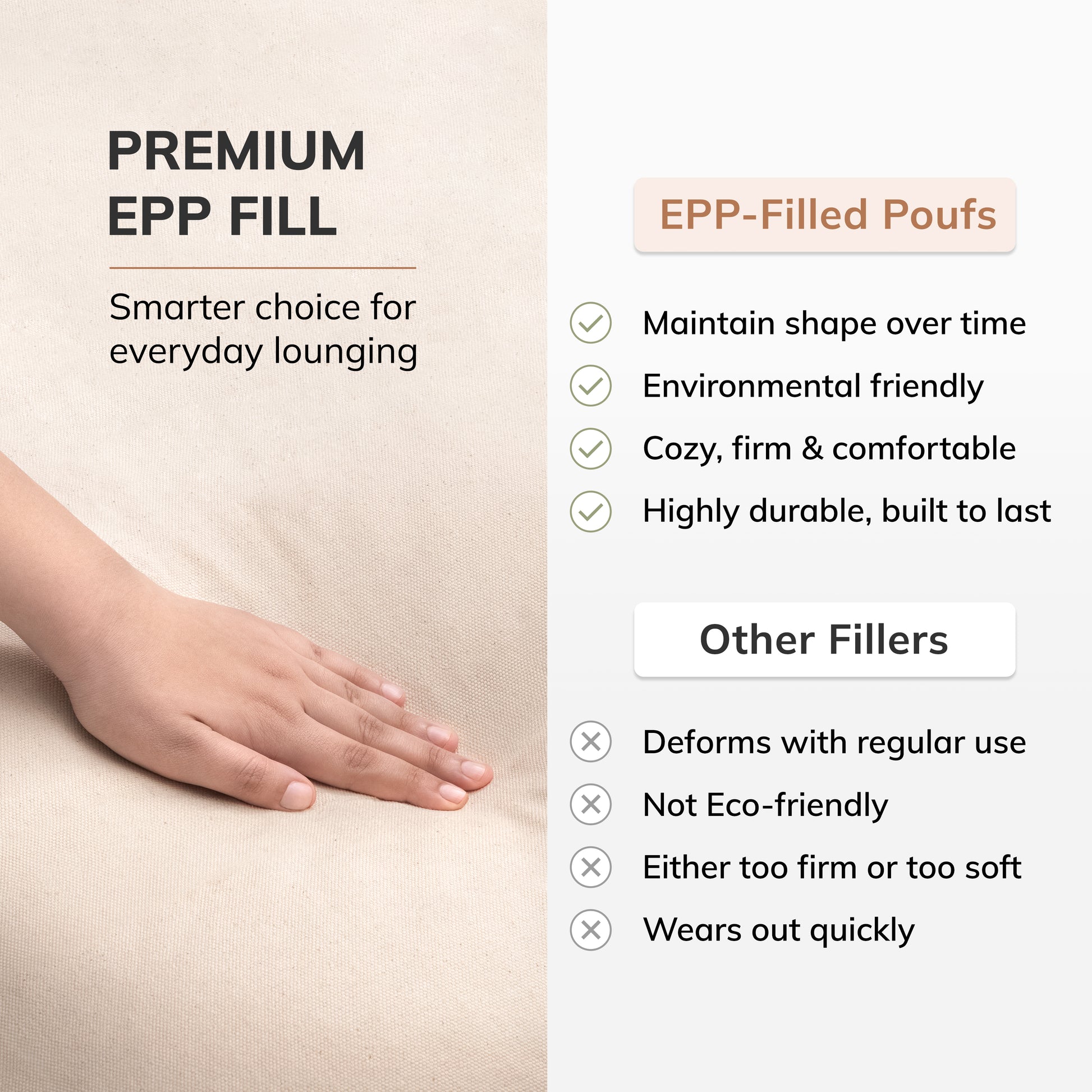 Crafted meticulously and designed for everyday use, our poufs offer a blend of comfort and functionality. Each pouf seat is made using top-quality materials and filled with premium, firm, and non-shrinkable EPP beads, ensuring long-lasting support and durability. Whether you need a cozy footrest, a comfortable reading seat, or a stylish decor accent, these poufs effortlessly enhance your home decor.