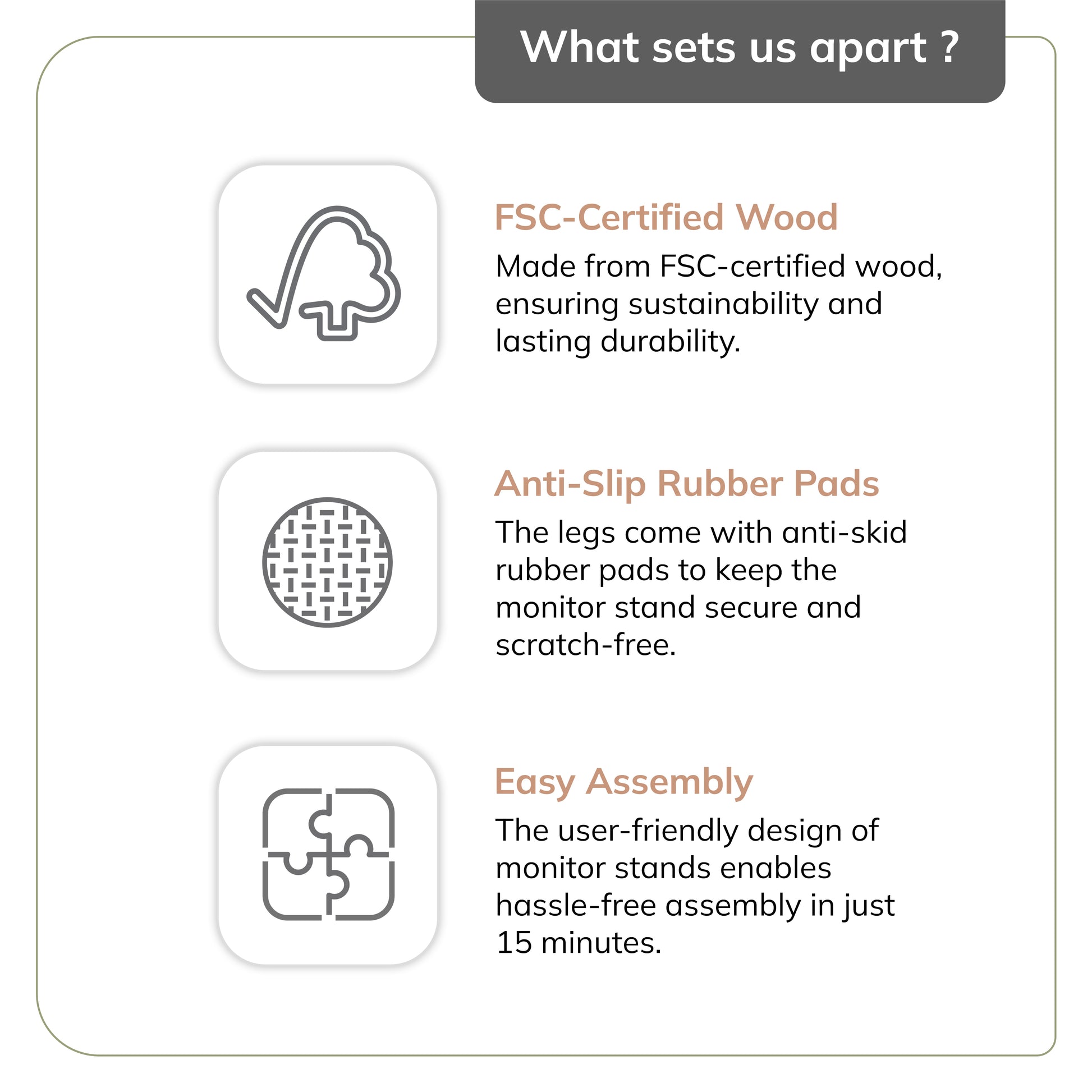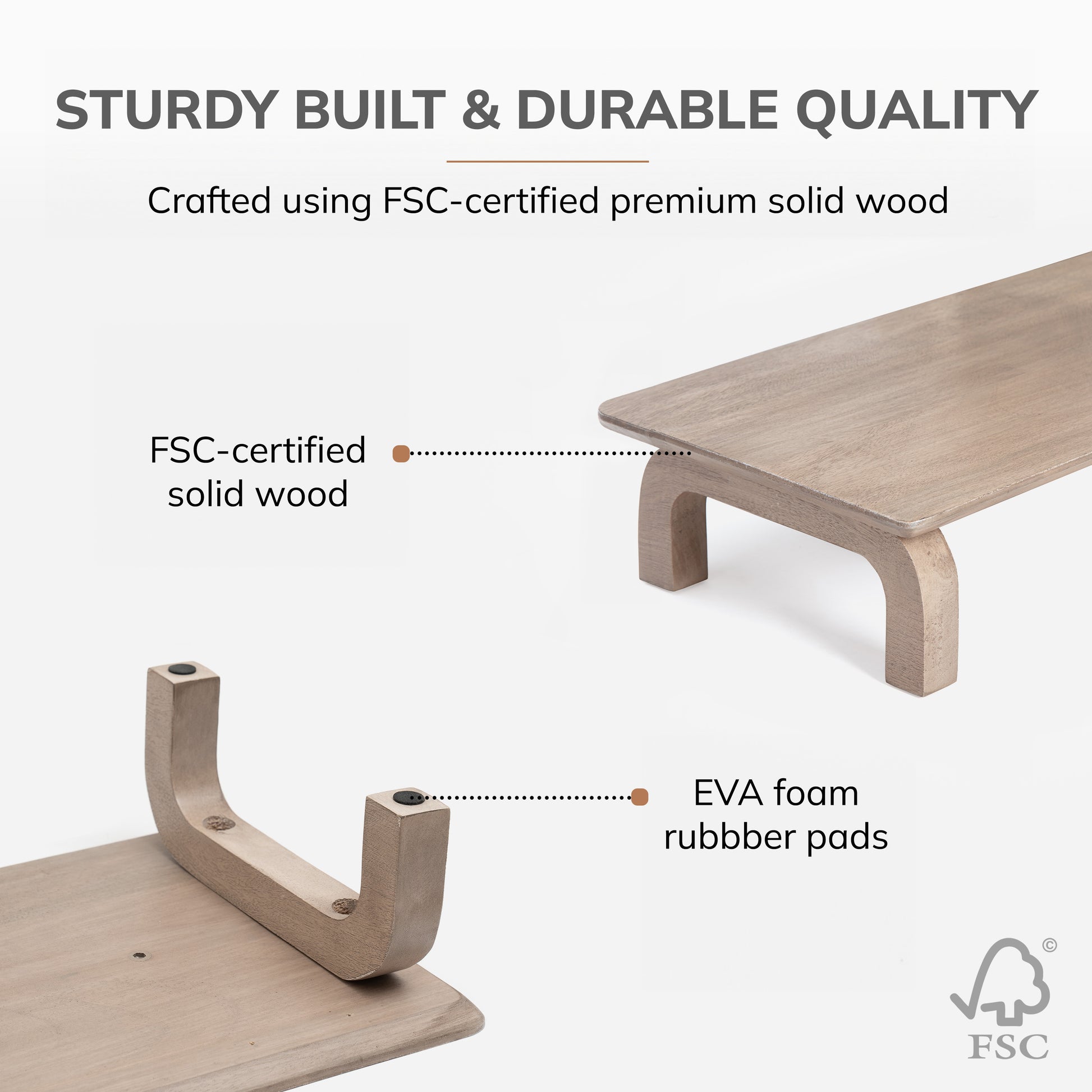 Anti-skid EVA foam foot pads ensure stability, while the optional power model features two USB outlets (one Type A, one Type C) for convenient charging of your devices. With a weight capacity of up to 22 pounds (24" wide) and 110 pounds (40" wide), our Monitor Stands can accommodate a variety of monitor setups, making them a versatile and stylish addition to any workspace.